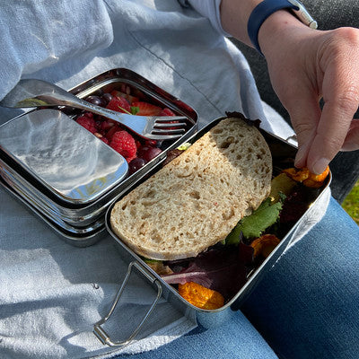 This fabulous lunch box with clip closure has two tiers and a mini container, so you can pack a starter, main course and pudding! Perfect for packed lunches for the kids or the grown ups! A lovely neat way to organise your food.